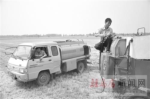 為服務(wù)三夏生產(chǎn),中石化駐馬店分公司積極組織送油車輛到田間地頭為農(nóng)機(jī)加油,以減少農(nóng)機(jī)為加油而浪費(fèi)時(shí)間,此舉深受農(nóng)機(jī)手的歡迎。圖為送油車輛正在田間在為農(nóng)機(jī)加油。記者 郭連山 攝