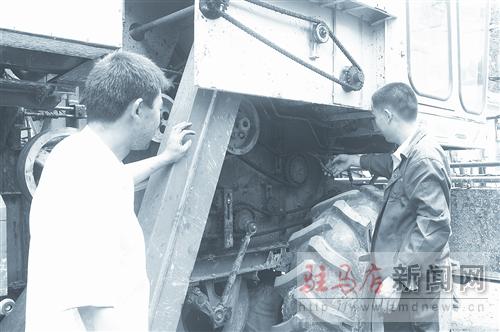 入夏以來,正陽縣農(nóng)機手和農(nóng)機技術(shù)員積極為農(nóng)機戶檢修農(nóng)機,全力以赴戰(zhàn)三夏。至目前,據(jù)不完全統(tǒng)計,該縣各鄉(xiāng)鎮(zhèn)已檢修農(nóng)機2000多臺,使全縣大型農(nóng)機得到一遍“安檢”。圖為農(nóng)機技術(shù)人員正在為農(nóng)機戶檢修收割機。通訊員 王