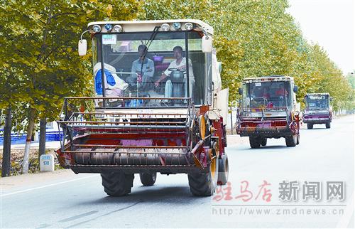 昨日上午,開封市的劉斌和同伴開著聯(lián)合收割機正駛向他們的目的地——泌陽縣沙河店鄉(xiāng)。在以后的一段時間里,他們將參與我市的麥收大會戰(zhàn)。晚報記者 劉永奇/攝