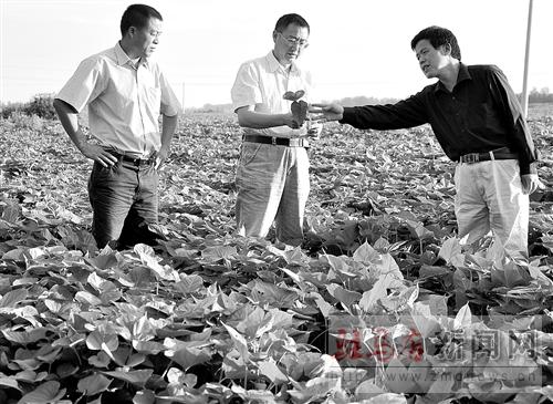 黃樓鎮(zhèn)瑩坤薯業(yè)技術(shù)人員到田間察看紅薯生長(zhǎng)情況