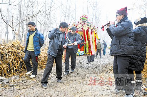 進(jìn)了新娘家,新娘的家人向“轎頭”遞上紅包,擺上白酒后,轎夫們將花轎擺成坐北朝南,只等新娘上轎。舉行一個(gè)簡(jiǎn)單的儀式后,新娘在家人的攙扶下坐進(jìn)了花轎。