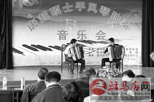 摘要: 10月27日,唐超碩士“古典與流行”手風琴音樂會在驛城區(qū)老干部活動中心舉行。唐超是駐馬店市人,自幼跟隨父親學習手風琴,現(xiàn)是手風琴專業(yè)碩士研究生,曾獲得大賽一等獎。圖為唐超(右)和父
