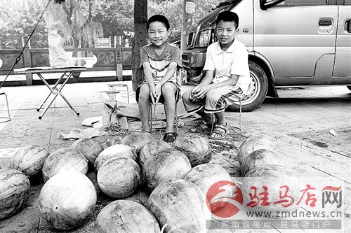 本報(bào)訊 “賣西瓜啦,5角錢一斤,先嘗后買,不熟包換。”7月14日上午,在市駿馬路中段一家屬院門口,倆男孩稚嫩的叫賣聲,引起了附近居民的注意。來自驛城區(qū)香山街道楊樓村的袁林軍(8歲)和張巖(13歲)是表兄弟。當(dāng)日,他倆跟隨袁林軍的父母來市區(qū)賣西瓜。為了招攬生意,兄弟倆在離大人西瓜攤不遠(yuǎn)的地方單獨(dú)擺了個(gè)西瓜攤。