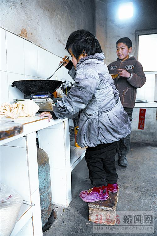 昨日下午,記者來到李靜家。此時(shí),李靜和弟弟正在廚房做晚飯。李靜踩著小板凳,艱難地翻炒著鍋里的菜,李奇在一旁幫忙。