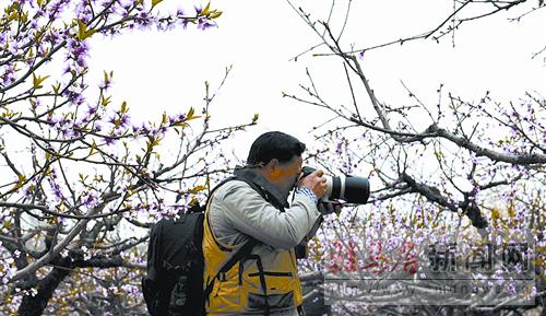 在萬畝桃園,游人拍照留念,欣賞桃花。站在萬畝桃園南側(cè)的山上放眼北望,近處是大片盛開的桃花,遠(yuǎn)方是綠油油的麥田、金燦燦的油菜花,美景盡收眼底。