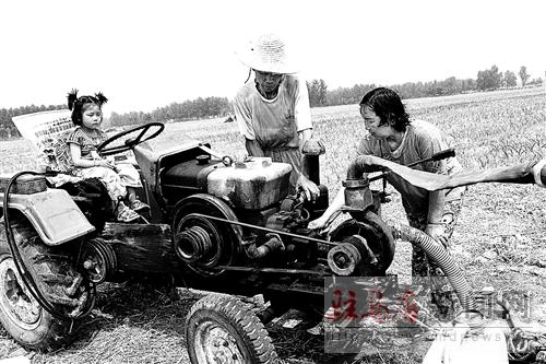 與雷世營家相鄰的一塊地里,村民雷大毛和老伴帶著孫女在烈日下,給自家的7畝地澆水。小孫女有病剛從診所出來,雷大毛就急忙開著拖拉機來到地里。