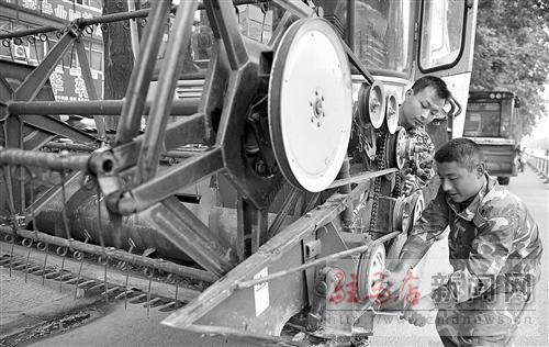 摘要: 5月22日,來自驛城區(qū)水屯鎮(zhèn)的農(nóng)機(jī)手正在檢修農(nóng)機(jī)。隨著小麥日漸成熟,來自山東、河北等地的聯(lián)合收割機(jī)開始聚集我市,為小麥?zhǔn)崭钭鰷?zhǔn)備。 記者 弓華靜 攝
