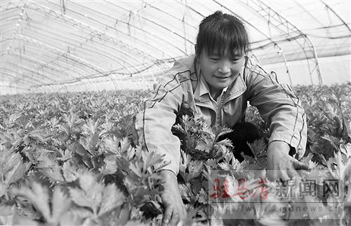 一個(gè)大棚、一畝多地、兩萬(wàn)多斤芹菜就可以賣兩萬(wàn)多元。陳小燕是驛城區(qū)水屯鎮(zhèn)劉付漢村村民,像她這樣種植溫棚蔬菜的農(nóng)民全鎮(zhèn)有4000多人。圖為陳小燕在大棚內(nèi)采摘新鮮蔬菜。 記者 吳 波 攝