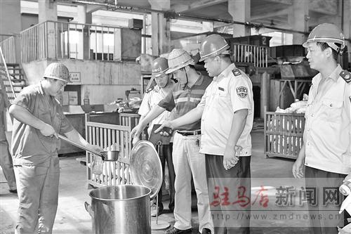 為督促用人單位嚴格遵守高溫期間的勞動保護措施,防止因高溫引發(fā)的安全生產(chǎn)事故。連日來,驛城區(qū)勞動和社會保障監(jiān)察大隊組織人員深入企業(yè)、廠礦等用人單位,檢查防暑降溫措施落實情況,要求用人單位嚴格按照規(guī)定進行生產(chǎn),保證勞動者有開水喝、有綠豆湯喝。圖為在中集華駿鑄造生產(chǎn)車間檢查時的情景。 記者 鄭付生 通訊員 李 嘉 攝影報道