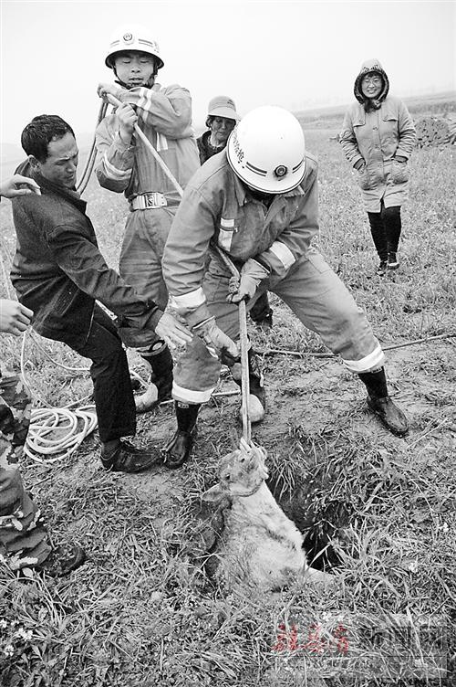上午11時(shí)許,打好活結(jié)的消防救援繩索被順利套到牛犢的脖子上,消防官兵一邊用棍頂住活結(jié)處,一邊拉緊繩索,套牢牛犢的脖子。大家合力將小牛犢在幾秒鐘內(nèi)順利從機(jī)井里拉了出來(如圖)。被救出的牛犢在地上躺了一會(huì)兒后,很快便站起來跑到不遠(yuǎn)的牛群中。