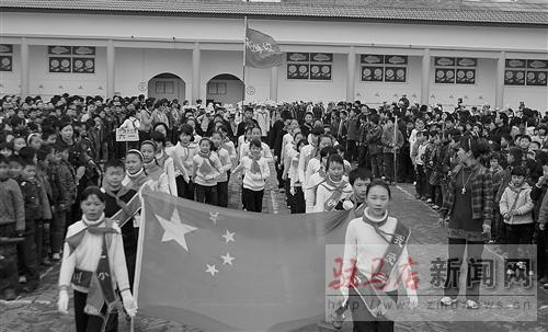 圖為兩所學(xué)校的少先隊(duì)員共同舉行升旗儀式