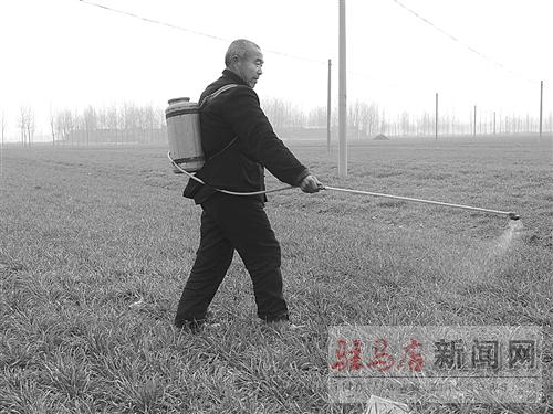日前,汝南縣在組織全縣干部群眾抗旱澆麥的同時(shí),積極引導(dǎo)農(nóng)民進(jìn)行春季麥田管理,現(xiàn)已有80萬(wàn)畝小麥噴灑了除草劑和殺蟲(chóng)劑。圖為老君廟鎮(zhèn)雷莊村肖莊村民組農(nóng)民正在麥地里噴灑除草劑。記者 劉仁忠 通訊員 呂 娜 攝影報(bào)道