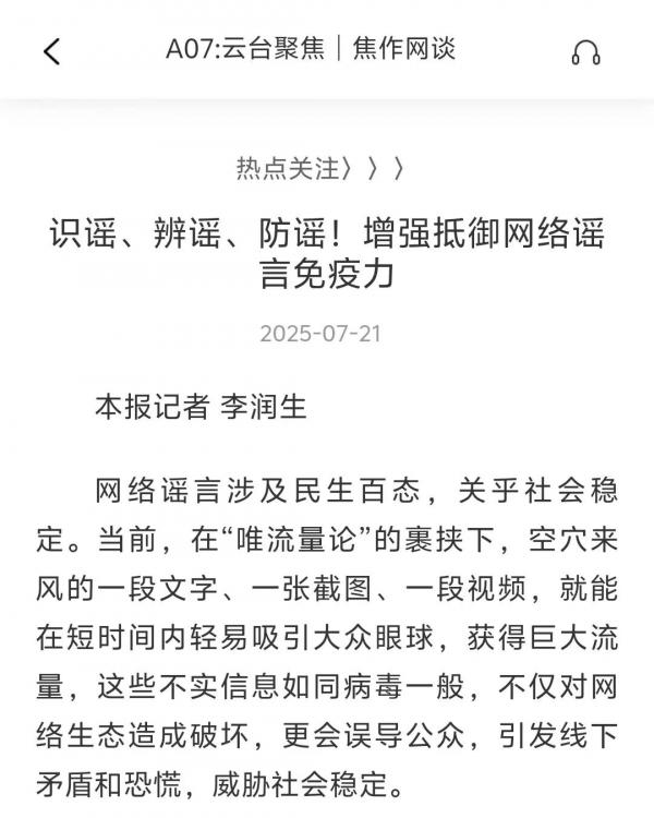 作品簡(jiǎn)介:該新聞稿件首發(fā)于焦作日?qǐng)?bào)2025年7月21日《焦作網(wǎng)談》欄目,并結(jié)合融媒體優(yōu)勢(shì)和影響力,在焦作網(wǎng)、焦作客戶端、焦作網(wǎng)微博等平臺(tái)發(fā)布。稿件用今年當(dāng)?shù)匕l(fā)生的謠言案例為生動(dòng)例子,讓網(wǎng)友認(rèn)識(shí)到,上網(wǎng)當(dāng)有“謠言抗體”,記者與焦作市委網(wǎng)信辦結(jié)合,將識(shí)謠、辨謠、防謠,知識(shí)要點(diǎn)融入稿件,提高網(wǎng)友們識(shí)別網(wǎng)絡(luò)謠言的能力,并呼吁廣大網(wǎng)民,不信謠、不傳謠、不造謠,共同阻斷謠言傳播鏈條。