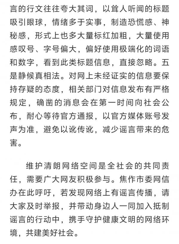 摘要:稿件用今年當(dāng)?shù)匕l(fā)生的謠言案例為生動(dòng)例子,讓網(wǎng)友認(rèn)識(shí)到,上網(wǎng)當(dāng)有“謠言抗體”,記者與焦作市委網(wǎng)信辦結(jié)合,將識(shí)謠、辨謠、防謠,知識(shí)要點(diǎn)融入稿件,提高網(wǎng)友們識(shí)別網(wǎng)絡(luò)謠言的能力,并呼吁廣大網(wǎng)民,不信謠、不傳謠、不造謠,共同阻斷謠言傳播鏈條。