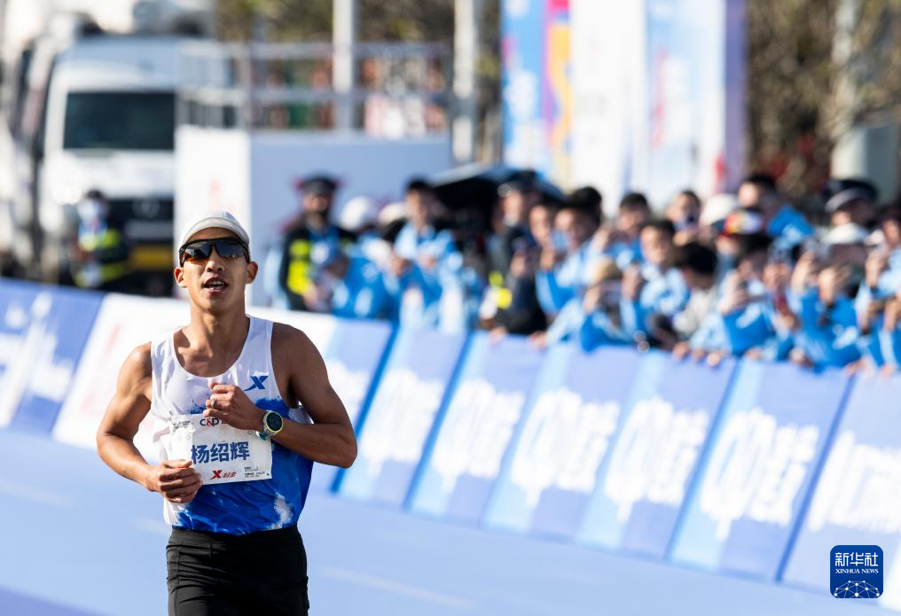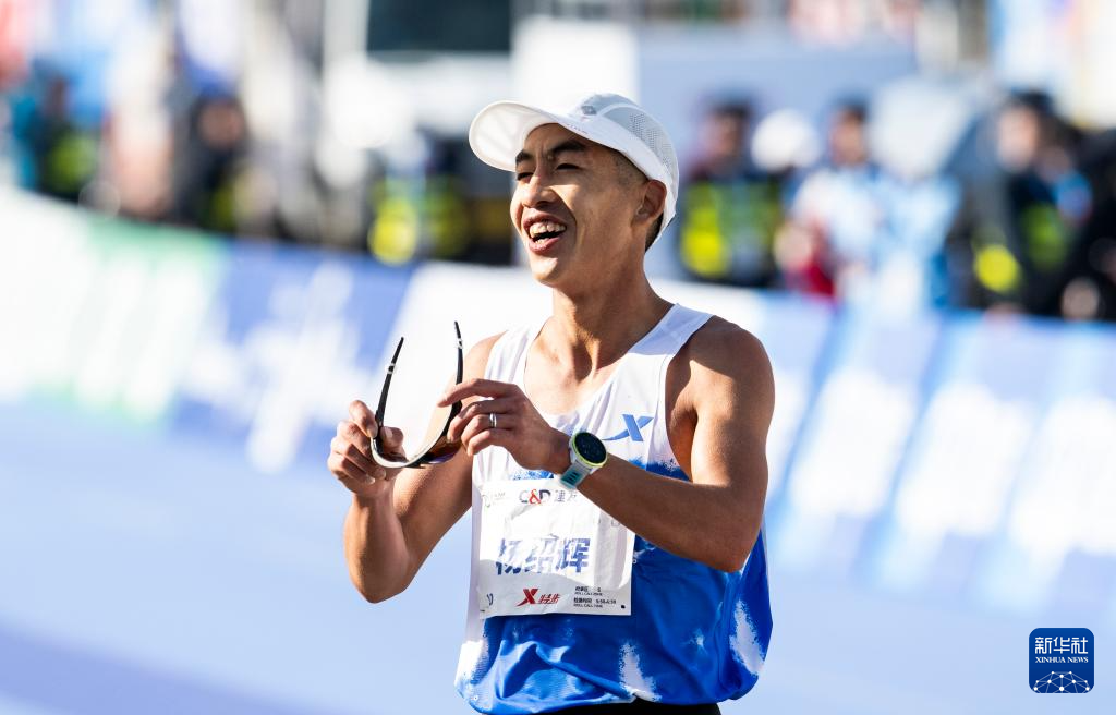 1月11日,楊紹輝在沖過終點線后慶祝。最終他獲得中國籍男子組第一名。