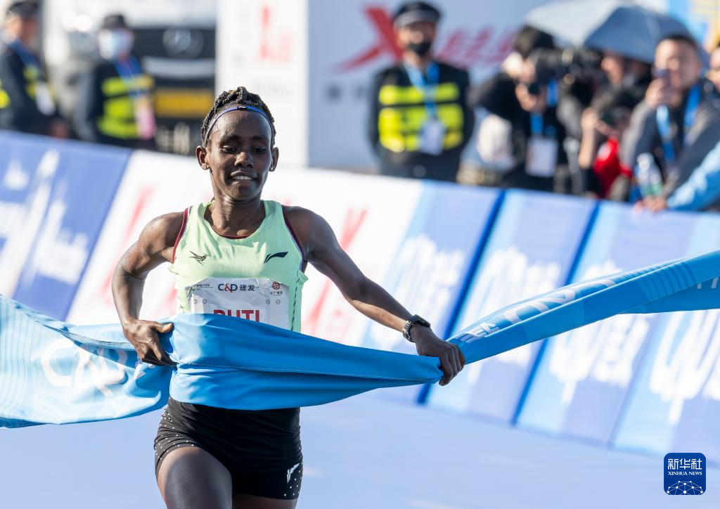 1月11日,埃塞俄比亞選手魯?shù)?middot;阿加·索拉沖過終點線。最終她獲得女子組冠軍。